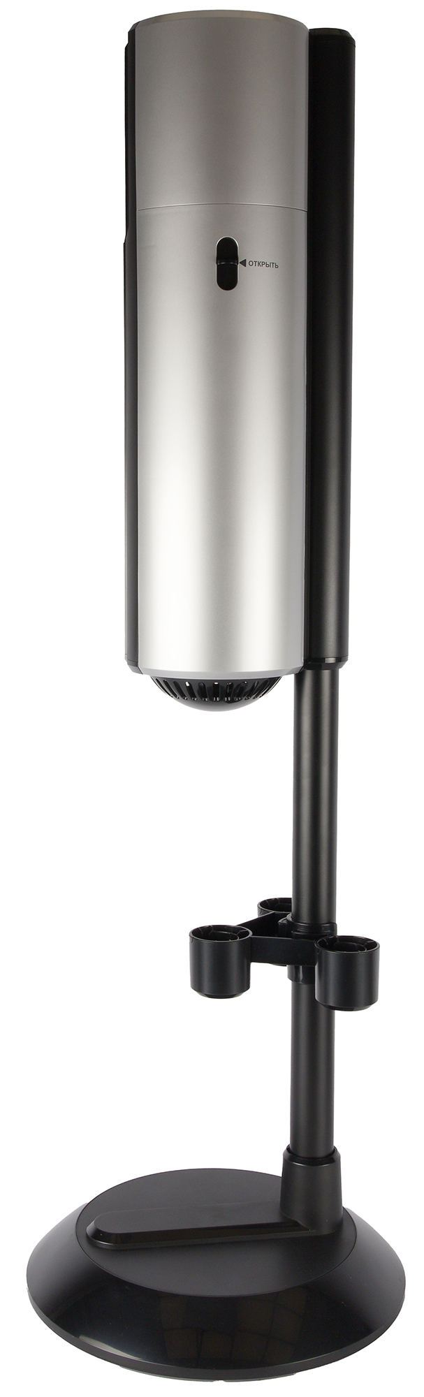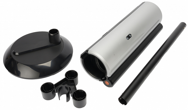 Базовая станция для зарядки и самоочистки поставляется в разобранном виде. Она состоит из корпуса с отсеком для мусора, круглого основания, удлинительной трубки и устанавливаемого на трубку крепления для насадок.