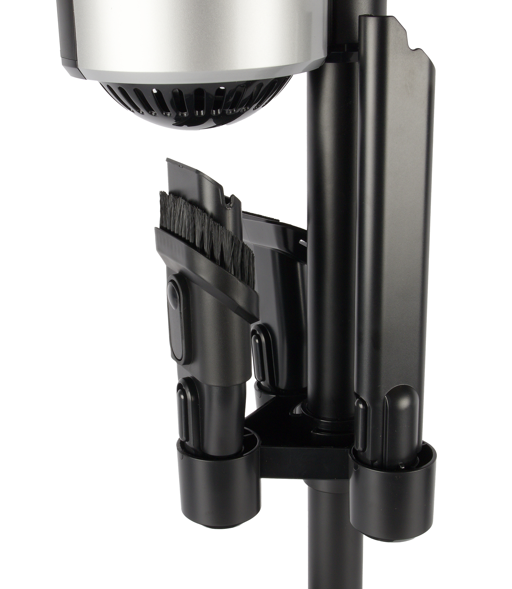 Крепление позволяет закрепить на базе все три немоторизованные насадки. Места для хранения мебельной электрощетки, к сожалению, не предусмотрено. Не рассчитана станция и для хранения удлинительной трубки с половой щеткой: при работе в ручной конфигурации их придется оставлять рядом с зарядкой.