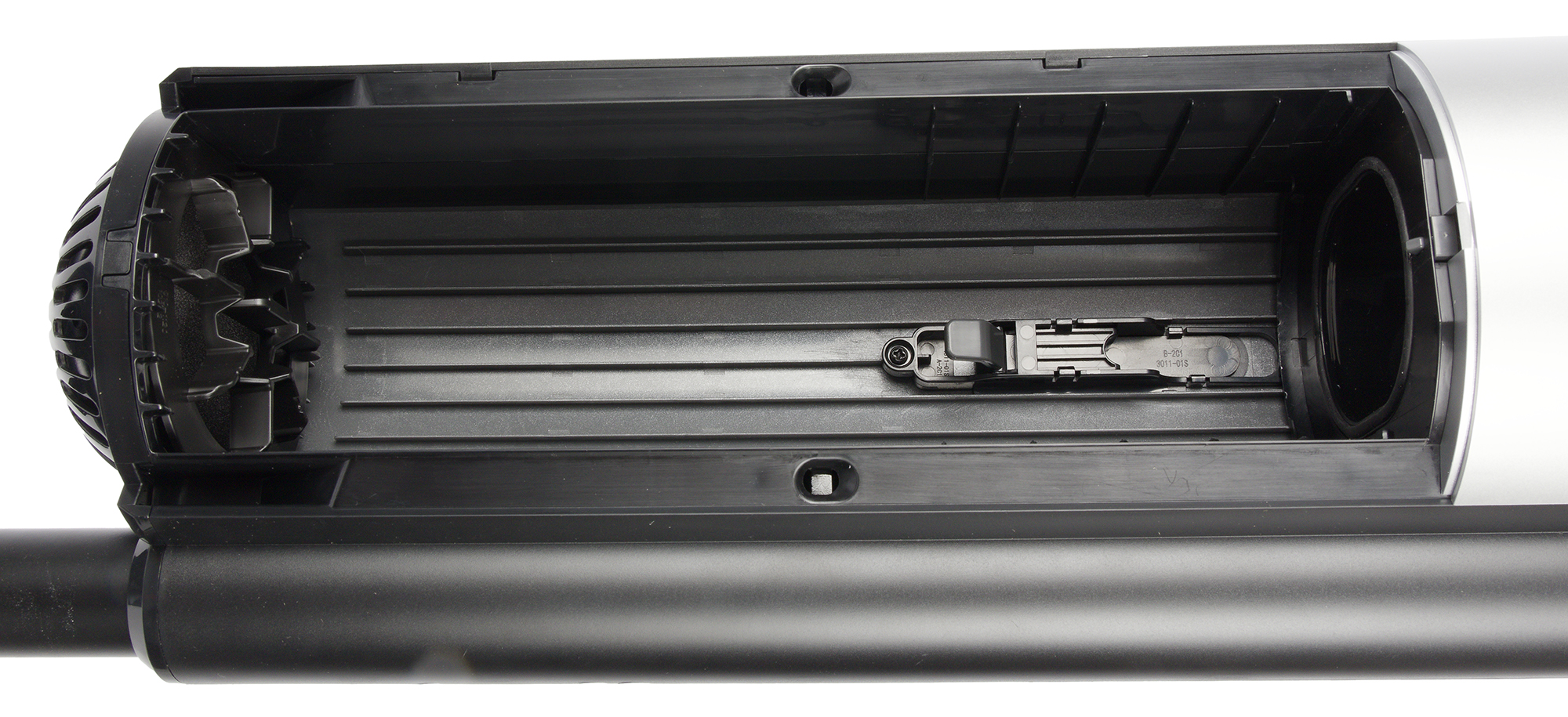 Двигатель пылесоса расположен в средней части моторного блока. Сферический отсек, в котором он смонтирован, сделан из гладкого темного пластика и оснащен светодиодной подсветкой, изменяющей цвет в зависимости от выбранного режима работы.