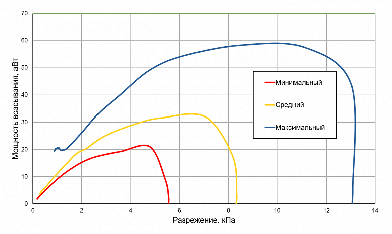 Измеренная нами мощность всасывания составила 21 аВт в минимальном режиме, 32 аВт — в среднем, и 58 аВт — в максимальном.