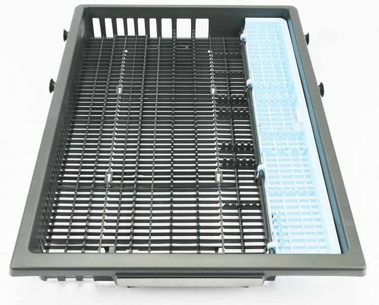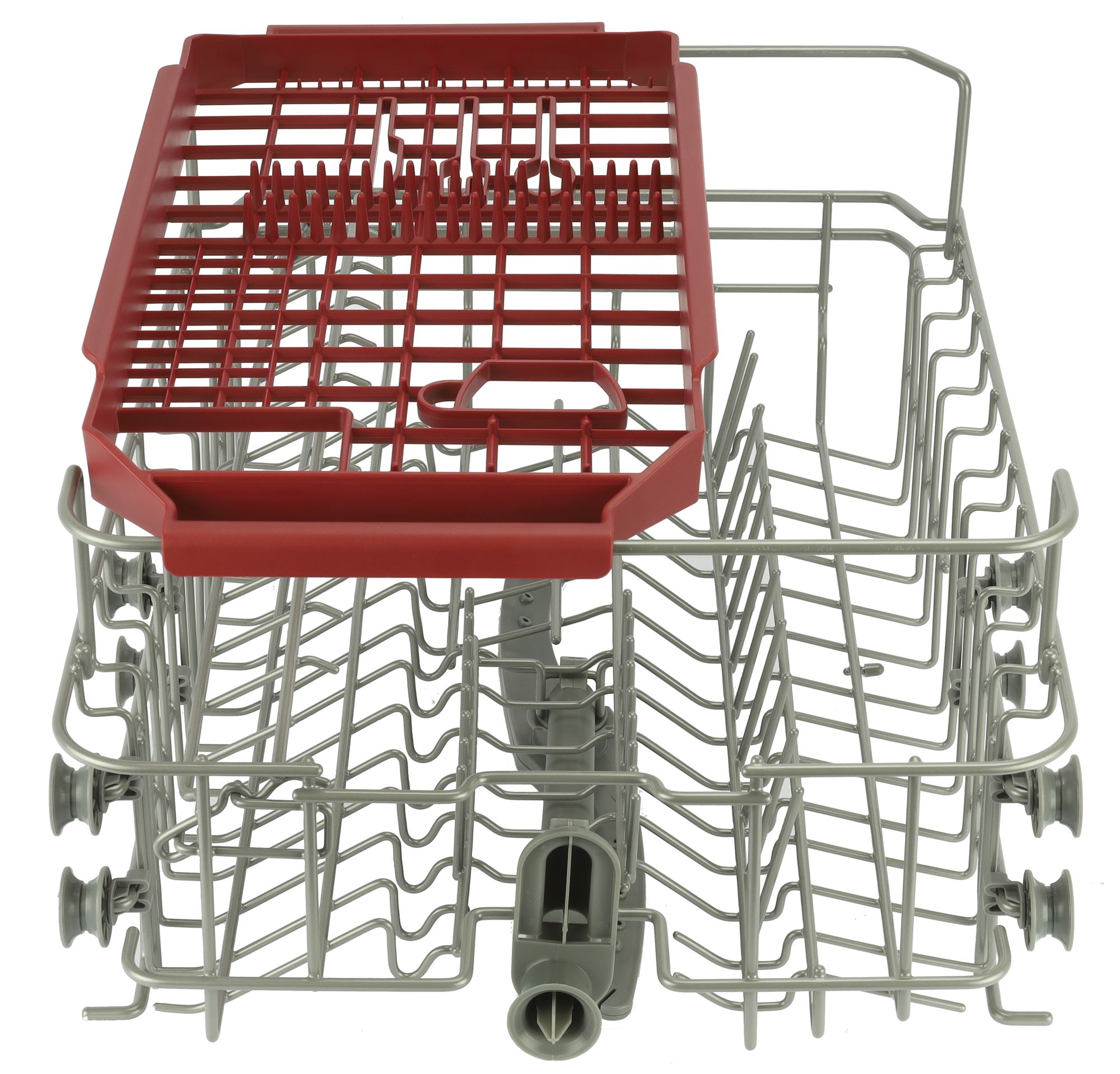 Верхняя корзина состоит из двух частей: рамы с роликами по бокам и пластикового решетчатого подноса с разделителями. Поднос можно вынимать и разбирать столовые приборы на столе, а если его вытащить и не использовать, значительно увеличив пространство средней корзины в высоту, это позволит поставить в нее высокую крупную емкость.