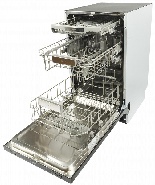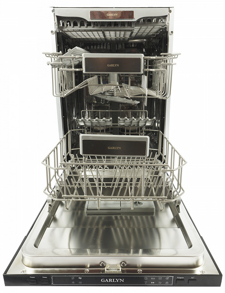 Garlyn GDW-1045 рассчитана на 11 комплектов посуды и предлагает семь программ. В тестах она показала хороший баланс между функциональностью и экономичностью. В режиме «Эко» потребление составило всего 8,9 литра воды, это достойный результат. Сушка здесь конденсационная: стеклянные и пластиковые предметы оставались слегка влажными, но металлическая и керамическая посуда была чистой и почти сухой. Тестировщики отметили, что машина легко справляется с обычными загрязнениями и не перегружена сложными режимами — «поставил и забыл». Кроме стандартных режимов (эко, интенсивная, стекло) предусмотрены две быстрые программы с разной продолжительностью, температурой воды и количеством циклов полоскания; программы Light для мытья несильно загрязненной посуды и программа для быстрого ополаскивания посуды, которую предполагается помыть позже (чтобы не присохла грязь).
