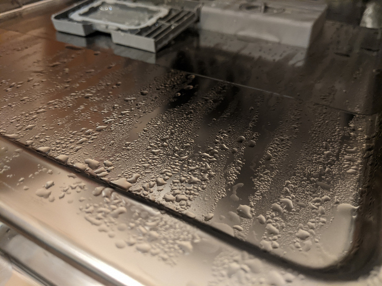 Сушка снова оказалась типичной для конденсационной технологии — пластик и стекло иногда оставались с каплями, значительное количество конденсата осталось внутри на дверце. Нет датчика чистоты воды, позволяющего управлять длительностью и интенсивностью мытья, а результаты тестирования в некоторых программах мы нашли хорошими, но не отличными.