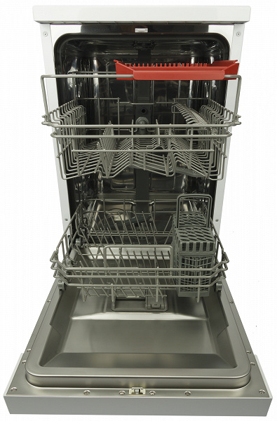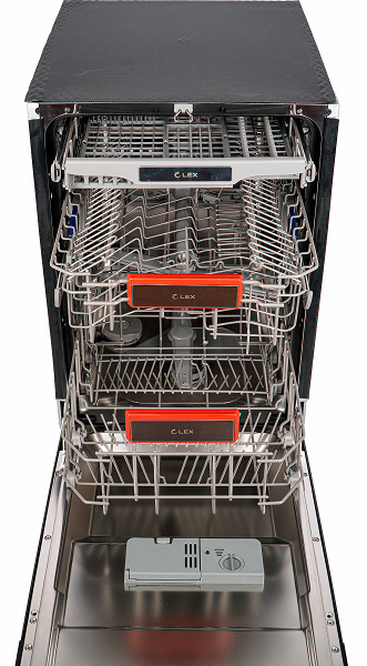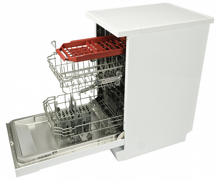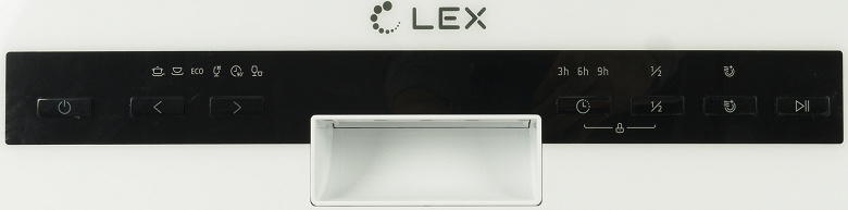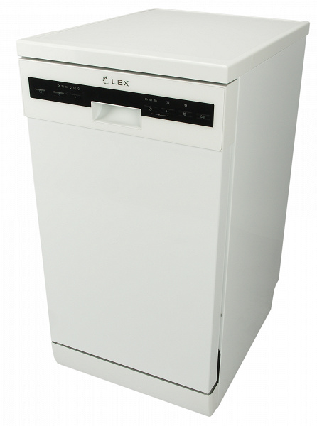 Lex DW-4562 WH рассчитана на 10 комплектов и располагает довольно простым простым набором функций. Так, программ всего шесть (нормальная, интенсивная, эко, стекло, 90 минут, быстрая), отсрочка старта возможна на 3, 6 или 9 часов. В тестах прибор показал хорошее качество мытья, однако эффективность заметно снижалась при максимальной загрузке. Результат сильно зависит и от правильности расстановки посуды: если поставить тарелки и кастрюли аккуратно, то моет отлично; если «накидать» хаотично как попало, часть загрязнений может остаться, но при аккуратной эксплуатации справляется на уровне более дорогих конкурентов. Сушка здесь тоже конденсационная, и ее результат предсказуемый — полностью сухой посуды после цикла ждать не приходится.