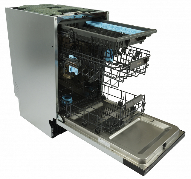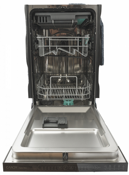 У машины есть полная защита от протечек, работа всех программ и режимов уверенная и предсказуемая. Есть блокировка от детей, индикация нехватки чего-либо и времени до окончания программы, таймер отсрочки старта до 24 часов, цветная индикация работы на полу. Интересно, что тут есть автоматическое открывание дверцы, что очень удобно, но срабатывает оно только в программе Эко — очевидно, чтобы стимулировать использовать именно ее. Обнаружили мы и достаточно оригинальное конструкторское решение для верхней корзины: она разборная, как и в Candy CI-1A7E1AA-08 (бренды родственные, так что неудивительно). Пластиковый поднос со столовыми приборами можно вынуть из машины целиком, чтобы потом разбирать их в другом месте.