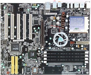 Это уже не первая плата из новой серии MAX, но здесь компания немного отклонилась в сторону от первоначального курса полного отсутствия всех Legacy-портов на плате. На этот раз мы видим разъемы PS/2 на своем привычном месте, да и слотов PCI, видимо, в соответствии с пожеланиями покупателей, стало побольше.