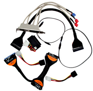 - Кабели: 2 Serial ATA, один ATA66/100/133 и шлейф для подключения дисковода последние убраны в черный кембрик для улучшения вентиляции в корпусе;