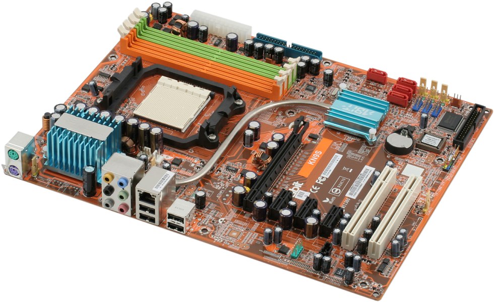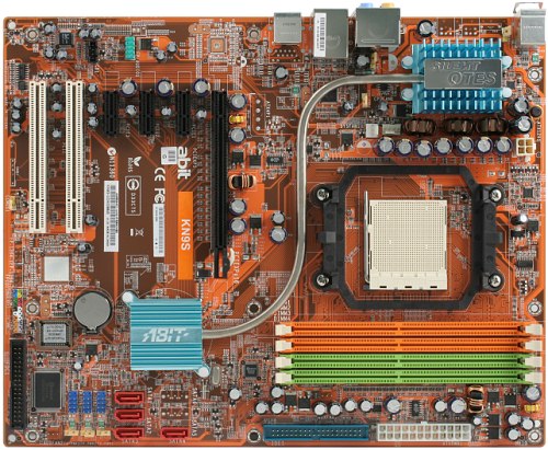 Компоновка платы достаточно удобная и достойная похвалы, свободный доступ ко всем разъемам и перемычкам обеспечивается после установки ее в корпус, разъемы питания размещены с краю, и даже разъем для флоппи-дисковода не оказался задвинутым за крайний PCI-слот. Впрочем, два слота PCI в сочетании с тремя бесполезными PCIEx1 смотрятся не оптимально, но объяснение этому простое — у модели KN9 SLI, имеющей аналогичный дизайн, на месте крайнего PCIEx1 установлен второй графический порт PCIEx16, и если бы конструкторы решили в младших моделях на его месте поставить PCI, это потребовало бы более серьезного вмешательства в разводку.