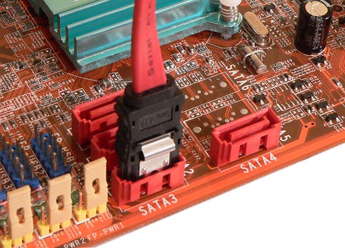 Из удачных конструктивных решений отметим SATA-разъемы с отверстиями для фиксаторов, соответствующие кабели в комплекте имеются для подключения всех четырех устройств, поддерживаемых платой. Наверное, многие, впервые столкнувшись с SATA-интерфейсом, удивлялись хлипкости и механической ненадежности этого технического решения, нередко штекеры выпадают при транспортировке компьютера. А пользователи, имеющие RAID-массив, наверняка, сталкивались с ситуацией, когда после установки в компьютер очередной платы (или любых работ в корпусе), RAID-контроллер сообщает о «потере» какого-нибудь диска, и приходится снова открывать корпус для отлавливания ускользнувшего SATA-хвоста.