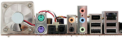 - 5 разъемов для подключения вентиляторов (два из них с возможностью контроля количества оборотов, к одному из регулируемых разъемов подключен вентилятор системы ABIT OTES, к одному из нерегулируемых разъемов подключен вентилятор на северном мосту чипсета).