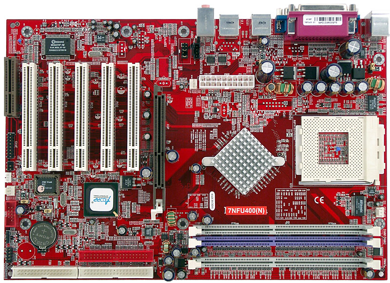 Плата достаточно небольшого размера, а мы уже давно знаем, что данная характеристика почти всегда является синонимом не очень удобной разводки. Доступ к некоторым из имеющихся перемычек может быть затруднен при установке платы в корпус, краткое описание их функциональности на текстолите платы отсутствует. В двухканальном импульсном стабилизаторе напряжения питания процессора применены три конденсатора по 2200 мкФ и 5 по 1500 мкФ. Также на плате находятся стабилизаторы напряжения шины AGP (включающий 2 конденсатора по 1000 мкФ и несколько менее емких) и памяти (1 на 1500 мкФ).