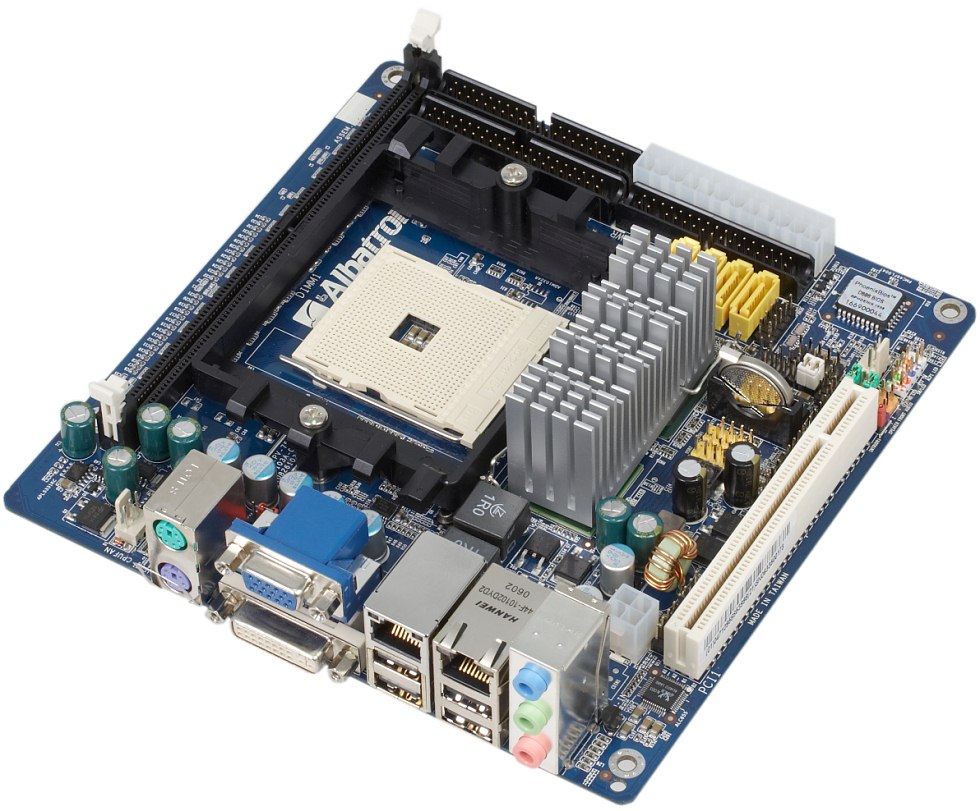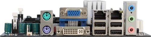 В двухканальном импульсном стабилизаторе напряжения питания процессора применены по 2 полевых транзистора на канал, 5 конденсаторов по 560 мкФ из «полимерной» серии PS и 1 электролитический емкостью 470 мкФ от United Chemi-Con и 3 электролитических по 1000 мкФ от Sanyo. Использование конденсаторов надежных марок похвально и практически неизбежно, когда необходимо заботиться о компактности, а значит, сокращать количество компонентов в цепях питания. Размер платы — 170?170 мм (Mini-ITX), крепление к корпусу четырьмя винтами.