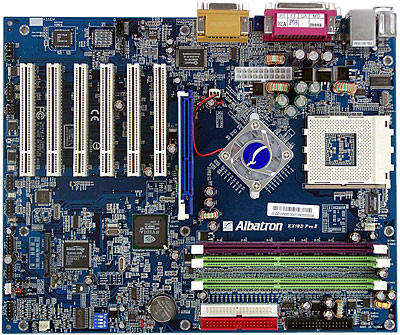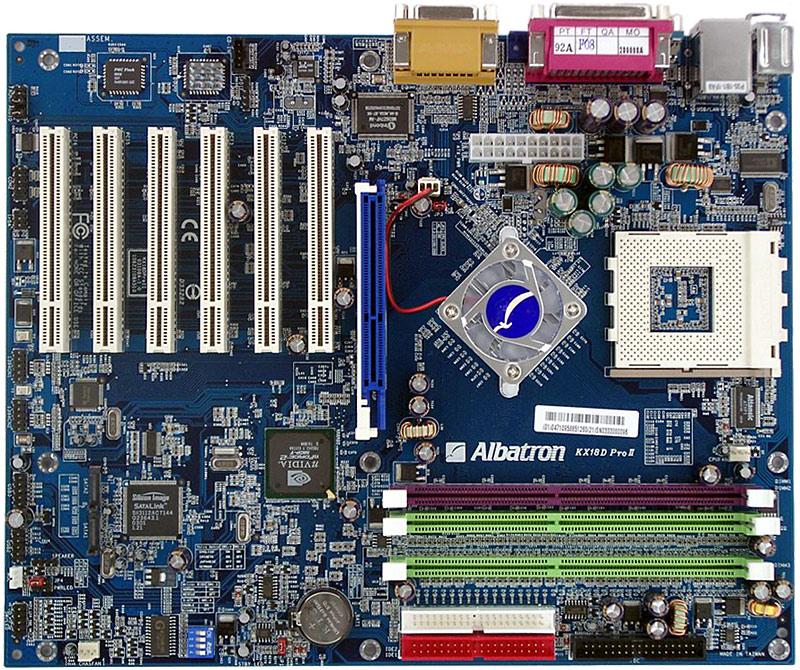 Разведенных, но нераспаянных элементов на этой плате, как и на всех моделях Pro II (они являются топовыми в своих линейках), нет. На базе той же PCB Albatron выпускает еще одну плату  KX18D Pro. Она отличается от рассматриваемой Albatron KX18D Pro II использованием менее функционального южного моста nForce2 MCP (на Pro II установлен MCP-T) и, соответственно, не имеет на борту контроллера FireWire. Кроме того, KX18D Pro не оснащается дополнительной микросхемой Serial ATA RAID.