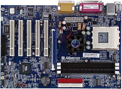 На плате отсутствуют разведенные, но нераспаянные элементы, а вот «парная» модель KX600 недосчитывается сетевого контроллера и соответствующего разъема. Однако одной сходной моделью на общей PCB дело не ограничивается: у этой пары есть полные аналоги на чипсетах KT400 (KX400-8XV Pro (с сетью) и KX400-8XV (без нее)) и KT400A (KX400-8XV Pro v2.0 (с сетью) и KX400-8XV v2.0 (без нее)). Разумеется, функциональность северного моста у этих пар прямо зависит от используемого чипсета, но на разводке плат это не сказывается, а южный мост во всех случаях один и тот же (точнее говоря, платы на KT600 вроде бы комплектуются VT8237, но новых функциональных возможностей у них, необъяснимым образом, при этом не появляется).
