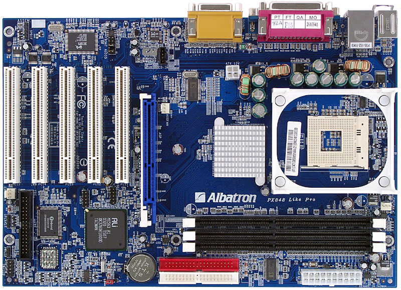 Всего Albatron предлагает 2 платы на базе чипсета ALi, выполненные на одной и той же PCB. Описываемая модель Pro является старшей в линейке, поэтому неудивительно, что на ее текстолите отсутствуют разведенные, но не распаянные элементы, а вот модель PX848 Like лишена сетевого контроллера. Размер платы 305х200 мм («зауженный» ATX, крепление к корпусу шестью винтами, передний край платы может немного провисать). Для осуществления системного мониторинга используются возможности микросхемы Winbond W83697HF. Контролируются: