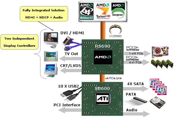 Северный мост, помимо графического ядра, отвечает за поддержку шины PCI Express, всего имеется 24 линии, из которых 16 используется для графического порта, 4 могут быть использованы для карт расширения или подключения интегрированных контроллеров (в первую очередь — сетевого, поскольку собственного MAC-адаптера чипсеты ATI уже достаточно давно не имеют), и еще 4 линии используются для соединения северного моста с южным. Графическое ядро поддерживает DirectX 9.0 и по 3D-функциональности аналогично Radeon Xpress 1150, также имеет 4 пиксельных конвейера, поддержка вершинных шейдеров эмулируется драйвером и выполняется центральным процессором. Частота увеличена с 325 до 375–400 МГц (на разных платах). Старшая версия (690G) поддерживает два независимых цифровых дисплейных контроллера, таким образом, выходы, которые могут быть распаяны на плате, включают VGA, DVI и HDMI в любых сочетаниях, единственным отличием младшей версии (690V) является отсутствие цифрового выхода (остается только аналоговый VGA). Также обе версии имеют интегрированный ТВ-выход. Интегрированное видеоядро может работать совместно с видеокартой, чем обеспечивается подключение трех — четырех мониторов.