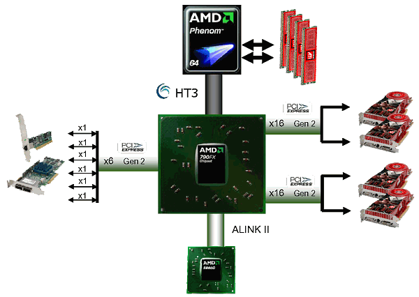 Если процессор можно сравнить с «мозгами», то чипсет по праву можно назвать «сердцем» платформы, поскольку функциональность системных плат, а значит, и компьютера в целом, задается именно этим компонентом. Соответственно, позиционируя процессоры Phenom, как решение, в первую очередь, для любителей игр и активных пользователей, AMD весьма логично решила выпустить и семейство чипсетов, которые своими характеристиками дополняли бы процессоры именно в заявленной роли. Осуществить задуманное AMD, с приобретением ATI, смогла и без помощи сторонних компаний.