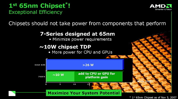 Не секрет, что до сих пор чипсеты производились преимущественно на устаревающих производственных мощностях, поскольку передовые линии дефицитны, и, например, для процессорных компаний логично использовать их для производства собственно процессоров. Но поддержка высокочастотных шин требует включения в состав чипсета блоков, работающих с частотами, вполне сравнимыми с блоками внутри процессора. Соответственно, тонкий техпроцесс, во всяком случае, чипсету не повредит, и, в первую очередь, позволит снизить тепловыделение, а значит, удешевить системы охлаждения, повысить надежность и расширить разгонный потенциал. Поскольку AMD пользуется услугами TSMC для выпуска чипсетов и графических процессоров, жертвовать «процессорными» мощностями, очевидно, не пришлось.