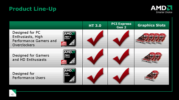 Рецепт получения AMD 770 очевиден, из 790FX просто исключен второй блок, соответственно, поддерживается единственный графический порт. Есть ли этот блок в чипе или физически исключен, сказать сложно, но для пользователей практической разницы не наблюдается, о каких-либо разблокировках, даже если блоки лишь логически отключены, речи давно не идет. Примечательно, что для AMD, унаследовавшей линейку ATI, чипсет с единственным графическим портом будет первым после существенного перерыва, в свое время ATI ограничилась выпуском чипсетов исключительно с поддержкой CrossFire.