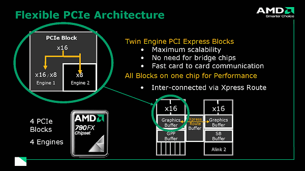 На схеме показано устройство контроллера PCI Express, 32 линии разделены на два блока, каждой группой по 8 линий PCI Express заведует свой «движок». Соответственно, при работе 4 карт, все 4 движка отвечают за поддержку «своей» видеокарты, для двух карт, движки группируются для получения 16 линий на каждом графическом порту, в обоих случаях блоки соединены между собой упомянутой шиной XpressRoute для обмена данными между видеокартами.