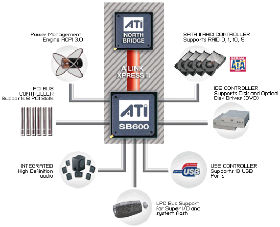 В качестве южного моста используется хорошо известный SB600, но ожидается и обновление до SB700, о характеристиках которого пока говорить рано (ожидается появление режима RAID 5 у SATA-контроллера и, вероятно, увеличение числа различных интерфейсов). Но с тех пор, как по скорости и надежности работы с USB-устройствами чипсеты ATI догнали конкурентов, объективных причин для недовольства не существует. А производители дорогих плат в любом случае будут комплектовать платы дополнительными контроллерами по собственному усмотрению.