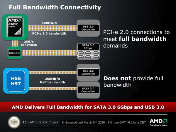 И первое, что подчеркивают в AMD, это полноскоростные внутричипсетные интерфейсы, что имеет смысл в контексте реализации SATA 3.0 и USB 3.0, во всяком случае, чтобы подключаемые устройства не просто были формально совместимы, а действительно, при необходимости могли обмениваться данными на заявленных скоростях. Надо уточнить лишь, что контроллер SATA 3.0 встроен в чипсет, а вот USB 3.0 прозводители плат будут реализовывать самостоятельно (и возможно не на всех платах), устанавливая дополнительные контроллеры. Тут заслугой чипсета AMD является лишь тот факт, что все PCIE-линки, а не только подводимые к графическим портам являются полноскоростными, то есть соответствуют версии 2.0. А у чипсетов Intel и NVIDIA линии для подключения внутренних контроллеров и слотов PCIEx1 имеют половинную пропускную способность.