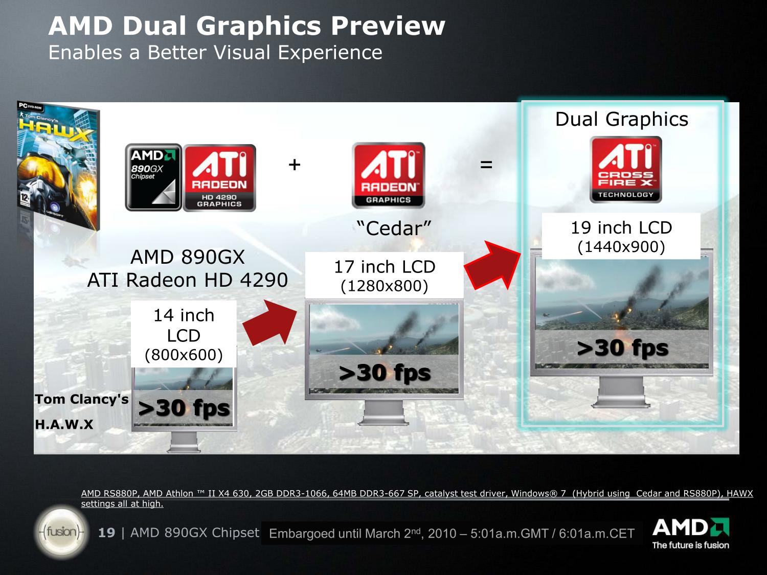 Вот как видят в AMD ситуацию с использованием графики начального уровня. Современные игры даже на дискретных картах из числа младших в линейке запускаются лишь на средних или умеренно-высоких уровнях качества, но в случае с интегрированной графикой, приходится существенно урезать и разрешение. Дискретная карта позволяет на том же уровне качества поиграть и на разрешении пригодном для 17-дюймового монитора, а объединение усилий дискретного и интегрированного графических ядер позволит поднять планку еще на ступеньку выше.
