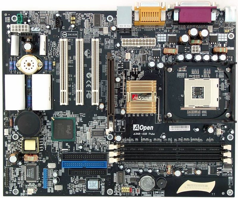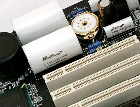 Разводка платы необычна, и виной тому, естественно, наличие лампового усилителя достаточно сказать, что на полноразмерную ATX-плату влезло всего 3 слота PCI. В результате разъемы аудиовходов, IDE, FDD и питания расположены не совсем удобно, а при вставленной видеокарте затрудняется работа с модулями памяти. Доступ к перемычкам не затруднен даже при установке платы в корпус, их краткое описание приведено на текстолите платы.