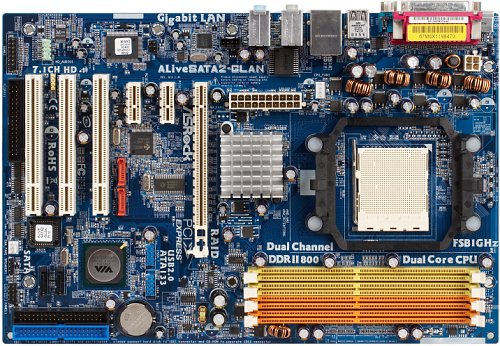 Дизайн платы достаточно любопытный — разъемы PATA вынесены в нижний угол, а SATA размещены двумя группами, причем одна пара находится едва ли не в центре платы. Впрочем, на удобство подключения и установки карт расширения такое отступление от компоновочных канонов не повлияло. Не изменяя традициям ASRock, разработки украсили плату надписями, вроде, «FSB1GHz», «Dual Core CPU» и прочими подобными откровениями. Отдельная строка рядом с PATA-разъемами советует пользователю подключать CD-ROM и жесткий диск к плате к разъемам IDE1 и IDE2 отдельными шлейфами.