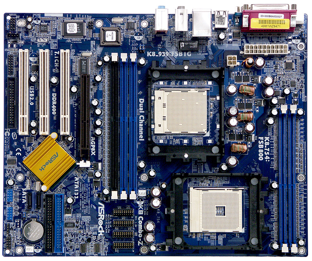 Компания ASRock продолжает развивать концепцию плат с двумя процессорными гнёздами. Очередной платой из серии Combo стала ASRock K8 Combo-Z. Эта модель сочетает на одном куске текстолита сразу два сокета (Socket 754 и Socket 939). Возникает вопрос: «А можно ли собрать на основе этого продукта двухпроцессорную систему?» Ответ очевиден из инструкции к плате: нельзя, так как переключение между двумя процессорами осуществляется с помощью перемычек и, когда один сокет работоспособен другой, соответственно, отключён.