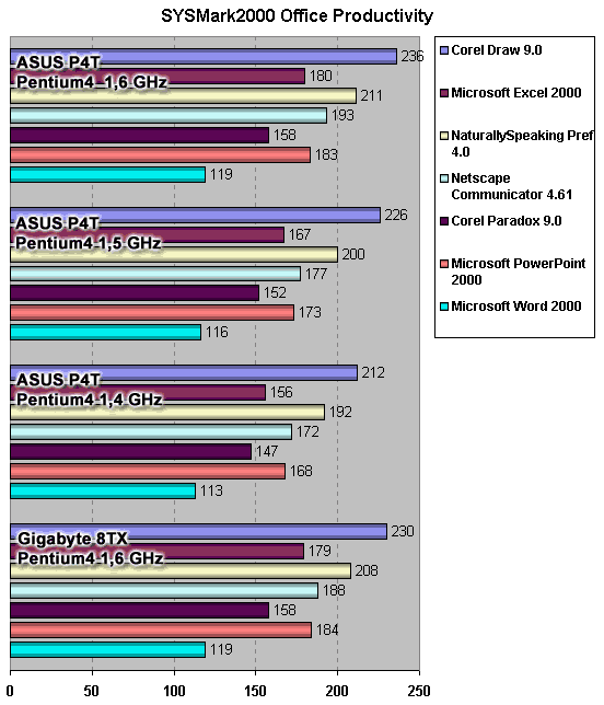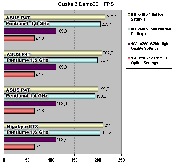 А пока мы просто посмотрим, насколько отличается производительность процессоров Pentium 4 с разными тактовыми частотами и насколько хороша плата ASUS P4T в сравнении с конкурентом — Gigabyte GA-8TX.
