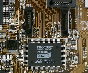 -  контроллер IDE RAID, реализованный на базе микросхемы Promise PDC20376, с возможностью создания RAID уровней 0 и 1 с подключением по протоколам ATA133 и Serial ATA150;