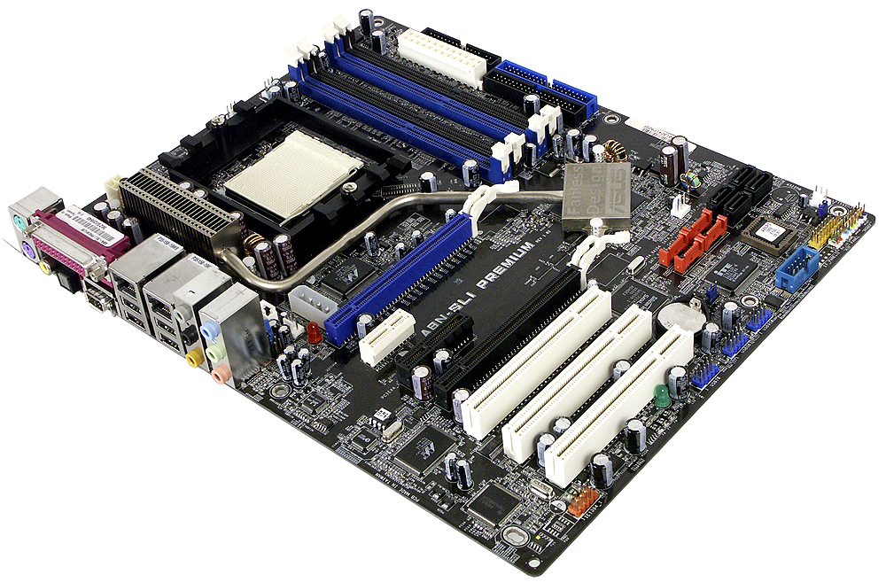 В трехканальном импульсном стабилизаторе напряжения питания процессора применены 9 конденсаторов по 1500 мкФ и 2 по 820 мкФ, также на плате находится стабилизатор напряжения памяти (10 конденсаторов по 820 мкФ (усилен индуктивными элементами)). В критических цепях применены в основном электролитические конденсаторы от компаний Rubycon. На плате нет разведённых, но не распаянных элементов. Отметим, что A8N-SLI Premium — это старшая модель из линейки системных плат компании ASUS, оснащённых чипсетом nForce4 SLI. Две другие — ASUS A8N-SLI Deluxe и ASUS A8N-SLI, отличаются от рассматриваемой нами сегодня платы, первая — тем, что управление режимом SLI у нее происходит "планочным" методом (т.е. с помощью планки-переключателя) и отсутствием AI Cool-Pipe, а вторая, кроме этого, лишена SATA RAID-контроллера Sil3114. Размер платы — 305х245 мм (полноразмерный ATX, крепление к корпусу десятью винтами, все края платы жестко фиксированы).