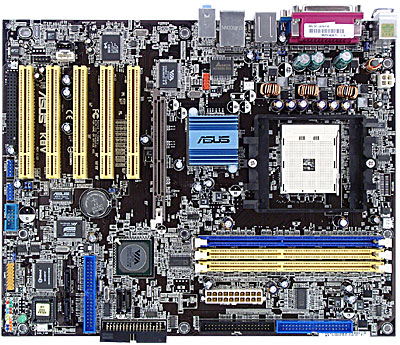 Компания не изменила традиционный дизайн платы и не передвинула разъемы памяти к процессору, развернув их, как мы видели на некоторых прототипах. Таким образом, ничего необычного в разводке платы нет, и ее недостатки вполне привычны для функционально насыщенных моделей: не совсем удобен для подключения ряд разъемов вдоль левого края, разъемы аудиовходов расположены перед слотами PCI, разъемы FDD и SATA/IDE RAID  позади них (первый, правда, «уложен на бок», так что мешать не будет), а размещение кабелей может препятствовать свободе манипуляций с модулями памяти. Доступ к некоторым из имеющихся перемычек может быть затруднен при установке платы в корпус, краткое описание их функциональности приведено на текстолите платы. Наличие напряжения +5 В Standby индицируется зеленым светодиодом. В трехканальном импульсном стабилизаторе напряжения питания процессора применены 6 конденсаторов по 1500 мкФ и 3 по 1200 мкФ; также на плате находятся стабилизаторы напряжения шины AGP (включающий 2 конденсатора по 1000 мкФ и несколько менее емких) и памяти (4 по 1000 мкФ).