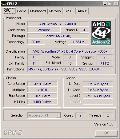 Результат весьма неплохой, но надо учесть, что он достигнут при минимальном повышении напряжения ядра (дальнейшее повышение не оказывало влияния, равно как не помогало и снижение частоты HT, и повышение напряжения северного моста чипсета и прочее), и ровно на такой же частоте шины «остановился» разгон еще одного процессора (Athlon 64 X2 3600+), что косвенно намекает на возможность улучшить результат нашего процессора с другими платами.