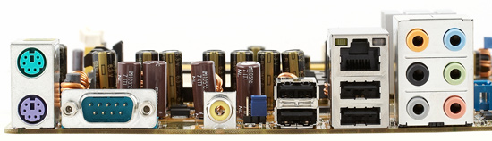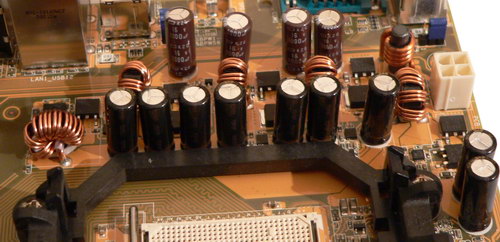 А вот схемы питания на этой плате выглядят неоднозначно. Формальные характеристики не вызывают возражений — импульсный 5-фазный стабилизатор напряжения для процессора, установлено по 2 полевых транзистора на канал, 9 конденсаторов по 1800 мкФ от Mitsubishi и 4 конденсатора по 1000 мкФ от United Chemi-Con. Остаются риторические вопросы: стоит ли требовать на современной плате обязательного использования полимерных конденсаторов (на наш взгляд — вовсе не обязательно, особенно если суммарная емкость, как в данном случае, достаточная, а сами конденсаторы греются очень слабо) и обязательно ли применение катушек индуктивности, залитых в корпуса, дабы избежать посторонних шумов при специфической нагрузке (здесь ответ уже не такой однозначный, мы склоняемся к тому, что все же желательно катушки заливать, с другой стороны, конкретно данная плата, сколько мы нарочно не прислушивались, вела себя образцово тихо). Ну а главное: с питанием разогнанного до 3,1 ГГц процессора стабилизатор справился надежно, нагрев элементов, при использовании коробочного кулера на процессоре, даже на ощупь был невелик, а установка кулера Zalman CNPS9500 AM2 и вовсе снижала температуру компонентов стабилизатора до комнатной.