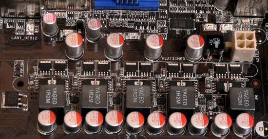 Стабилизатор напряжения питания процессора 5-канальный, установлены по 4 современных компактных полевых транзистора на канал (по 10 с маркировкой 5525L и 9025L), 10 конденсаторов — по 560 мкФ и 4 — по 270 мкФ, все конденсаторы на плате — твердотельные. В целом можно отметить не очень высокую емкость конденсаторов по сравнению с аналогичными схемами конкурентов, зато количество полевых транзисторов (от которого и зависит максимальный, пропускаемый через стабилизатор, ток и эффективность работы под нагрузкой, у этой платы близко к максимуму). Соответственно, заявленная поддержка процессоров с TDP=140 Вт имеет под собой все основания, и такие процессоры присутствуют в обширном списке протестированных на совместимость.