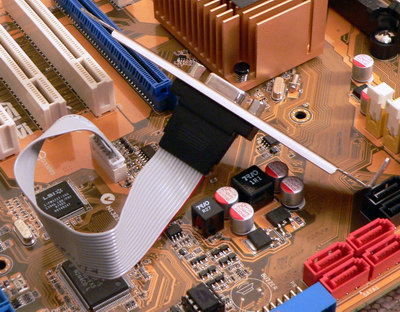 Наконец, самая большая, на наш взгляд, странность, которая в отличие от остальных претензий, наверняка повлияет на привлекательность платы в глазах потенциальных покупателей. Среди видеоразъемов на задней панели наличествует лишь HDMI, а для вывода VGA надо подключить дополнительный шлейф с планкой к разъему за слотами PCI. Это определенно не способствует сохранению качества аналогового сигнала, кроме того, сама планка займет место на задней панели и сократит число доступных PCI-слотов.