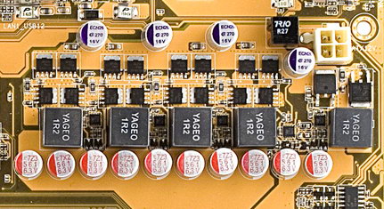 Стабилизатор напряжения питания для процессора импульсный 5-фазный (схема 4+1), в фазах, ответственных за питание ядра, установлено по 4 полевых транзистора на канал, а фаза, отвечающая за питание контроллера памяти, имеет два транзистора, установлены 10 конденсаторов по 560 мкФ и 4 конденсатора по 270 мкФ. Все без исключения конденсаторы на плате фирменные, твердотельные, катушки также все залиты в корпуса. Конструкция вызывает одобрение.