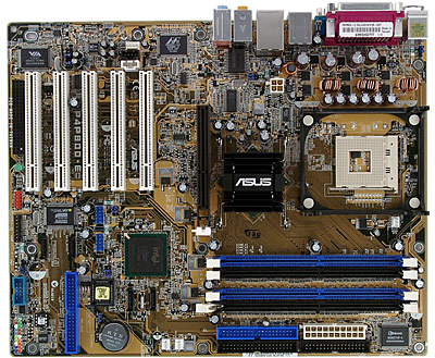 Эволюция уже рассмотренной нами платы P4P800 Deluxe. В данном продукте использованы несколько более функционально насыщенные чипы, чем в предшественнице: 5.1-канальный звуковой адаптер заменен на 7.1-канальный, установлен другой сетевой контроллер, IDE RAID уступил место более современному IDE/SATA RAID. Рассматриваемая далее комплектация платы относится к варианту поставки «Gold». Напомним, что целиком серия ASUS P4P800<