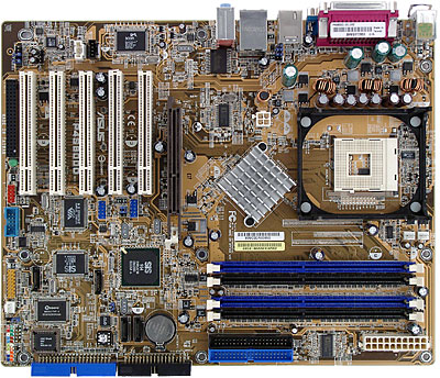 - 4 разъема под DDR SDRAM DIMM (до 4 ГБ DDR200/266/333/400, для включения двухканального режима требуется симметричное заполнение разъемов одного цвета попарно одинаковыми модулями, список сертифицированных модулей памяти можно найти в руководстве или на сайте ASUS);