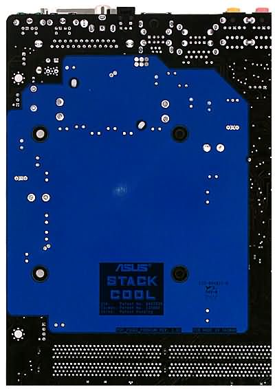 Однако два момента в оснащении платы стоит отметить особо: это медный радиатор, прикрывающий MOSFET'ы на цепях питания и алюминиевую пластину с тыльной стороны платы. Их комбинация носит название «ASUS Stack Cool» и призвана обеспечить хорошее и бесшумное охлаждение цепей питания и пространства под процессорным сокетом. Разумеется, основной группой пользователей, которых заинтересует это нововведение, являются оверклокеры :).