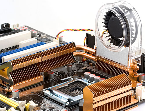 Впрочем, меньшая требовательность компонентов подсистемы питания к охлаждению, разумеется, не привела к экономии на этом важном (особенно при разгоне) элементе. На плате используется, можно сказать, «классическая» схема охлаждения чипсета: теплосъемник на южном мосту соединен медной тепловой трубкой с радиатором на северном (с большой площадью поверхности теплообмена), а тот, в свою очередь, при помощи двух тепловых трубок соединен с одним из двух дополнительных радиаторов на полевых транзисторах в цепи питания процессора. Конфигурация верхней части оребрения этих радиаторов позволяет устанавливать на них фирменные кулеры — в данном случае один идет в комплекте, но, впрочем, ASUS рекомендует применять активное охлаждение только в том случае, если для процессора используется СВО, не создающая тока воздуха в районе процессорного сокета.