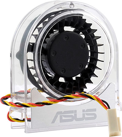 - Дополнительный радиальный вентилятор, монтируемый при необходимости на один из радиаторов набортной системы охлаждения (ASUS предлагает использовать его только в случае применения СВО для охлаждения процессора);