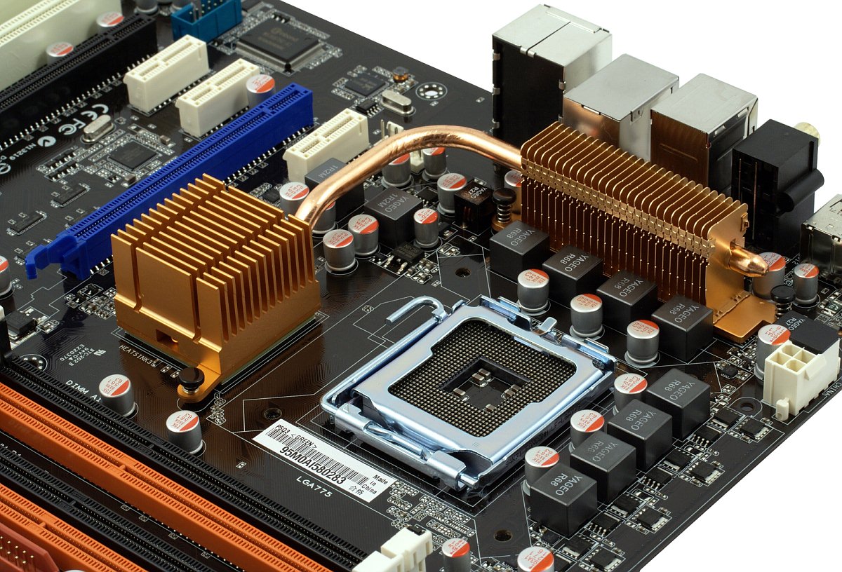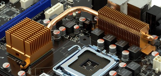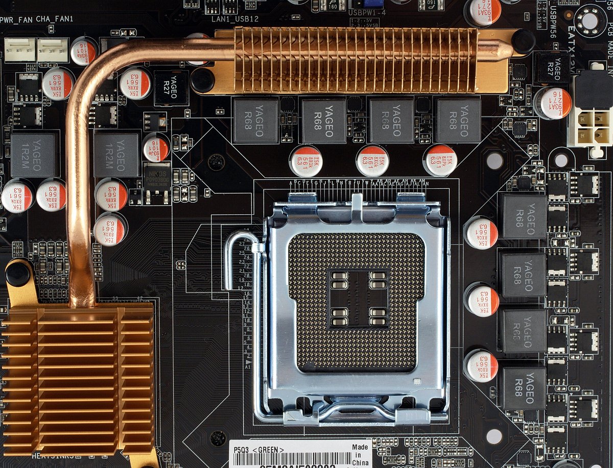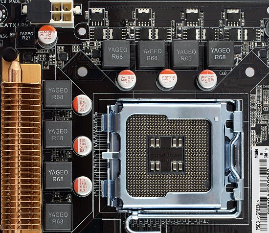 Стабилизатор питания процессора выполнен по полноценной 8-канальной схеме с тремя полевыми транзисторами на канал, преобразователи питания чипсета и модулей памяти — двухканальные. Не так давно это было бы признаком даже не просто топовой платы, а какой-то экстремальной серии, но сейчас, когда в моде тема многоканальных стабилизаторов и снижения числа активных каналов при простое (вроде как для уменьшения энергопотребления), а число каналов у ШИМ-контроллеров топовых моделей приближается к 20, меньше делать уже как-то неприлично. Впрочем, хуже плата от этого, разумеется, не становится, а если такой метод помогает привлекать покупателей — почему бы и нет. Очень хорошо, что в погоне за числом каналов не забывают и про качество прочих электронных компонентов: на всей плате используются только полимерные конденсаторы японского производства (Fujitsu) с повышенным сроком службы, полевые транзисторы с низким сопротивлением открытого канала (RDS(ON)), дроссели с ферритовым сердечником.