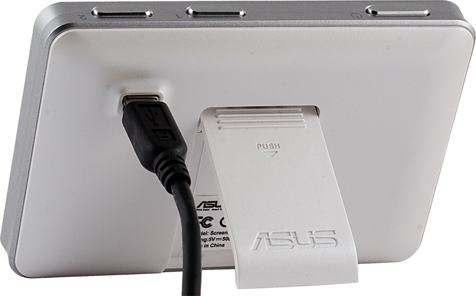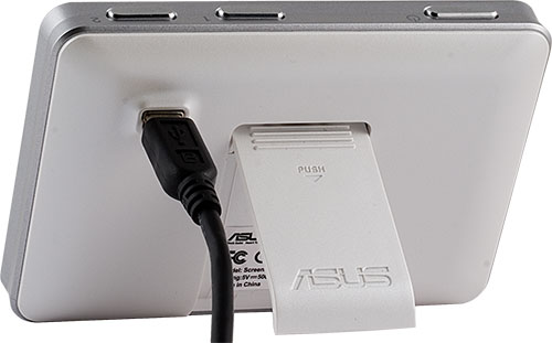 Выносным мы называем этот модуль потому, что без платы он не функционирует. Подключение к плате производится посредством стандартного USB-кабеля (на устройстве разъем mini-USB), к любому порту задней панели. Для манипуляций OC Palm удобнее держать в руках, а после можно положить на стол, прислонить к чему-нибудь или опереть на выдвижную ножку.