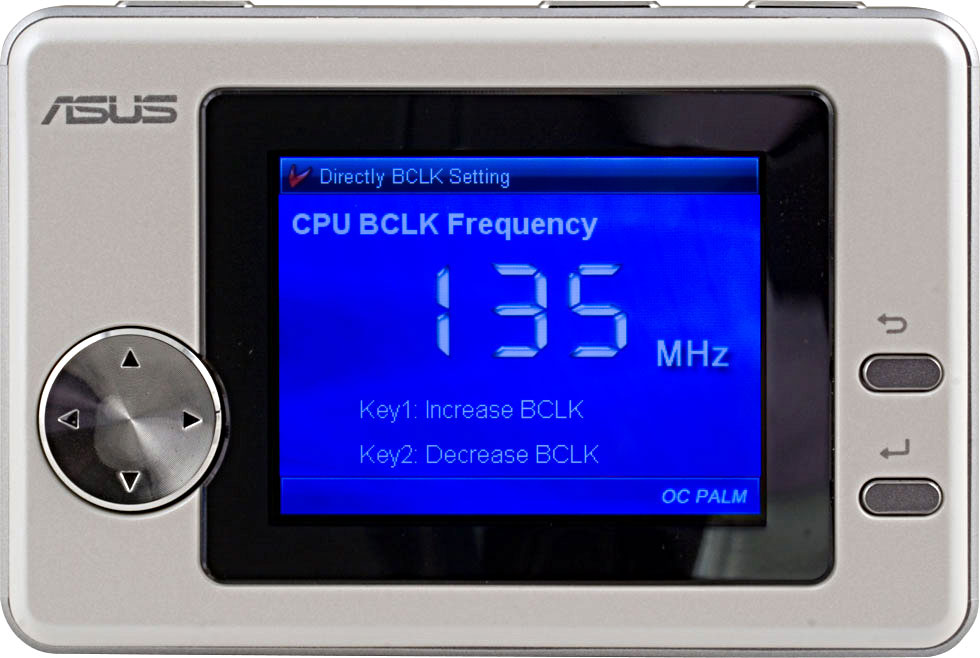 Теперь о том, зачем же нужен этот модуль. Как ни смешно, но отраженная в названии тема разгона действительно входит в перечень функциональных возможностей OC Palm. Нажатием кнопок на верхнем торце корпуса можно увеличивать или уменьшать базовую частоту, задающую через набор множителей частоту процессора, шины QPI и контроллера памяти. Разгон (или торможение) выполняется немедленно, в реальном времени, а текущая выставленная частота BCLK отображается на экране, который для выполнения этой функции на время выходит из режима текущей индикации. Если разгон (особенно таким способом) вас не интересует, то модулю все еще можно найти применение, выбрав режим работы через главное меню.