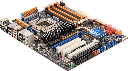 Система охлаждения чипсета и прочих горячих набортных компонентов типичная для топовых моделей. Как мы уже говорили в представлении чипсета Intel X58, тепловыделение северного моста находится на уровне предыдущих чипсетов среднего уровня, так что каких-либо особых подходов к охлаждению не требуется, ну а 16-канальная схема стабилизатора питания процессора равномерно распределяет максимальную нагрузку на значительное число полевых транзисторов, поэтому им повышенного внимания уделять тоже не нужно. Тем не менее, без кулера на тепловых трубках дело, разумеется, не обошлось. Правда, толстую медную пластину в основании радиатора северного моста, в которую впаяны тепловые трубки, украшает какое-то странное навершие с претензией на эффективное использование воздухотока от процессорного кулера, но мы склонны больше считать его декоративным элементом. В остальном схема вполне рабочая, и, судя по тактильно невысокому нагреву радиаторов, имеющая существенный запас на случай разгона — впрочем, при разгоне процессоров микроархитектуры Nehalem повышать напряжение и частоту работы северного моста необходимости нет.