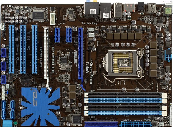 Печатная плата немного заужена, но разводку это практически не изменило — скажем, конвертер питания для модулей памяти и раньше был вынесен к чипсету. Сполна используя преимущество своего нового типа крепления модулей в разъемах (фиксаторы с одной стороны не имеют внешних подвижных частей), ASUS располагает слоты DIMM практически встык с первым слотом PCIEx16, благо это совершенно не мешает сборке. Радует отсутствие на бюджетной плате разъема FDD и порта LPT, хотя все-таки есть один разъем для подключения COM-порта на планке. P7P55D LE почти сохраняет раскладку и взаимное расположение слотов расширения, которые мы видели у старших моделей, только третий слот PCIEx16 уступил место более ожидаемому в данном случае PCI, и, конечно, второй слот PCIEx16 работает в режиме PCI Express 1.1 x4, будучи подключен к чипсету: лишь начиная с модели Pro, линейка P7P55D реализует полноценную поддержку SLI.