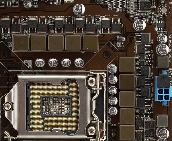 Стабилизатор питания процессора, как мы уже говорили, здесь упрощен по сравнению с топовыми решениями, но в целом уровень его реализации приятно высокий! Он выполнен по схеме с 8 каналами для ядра процессора и 2 каналами для Uncore-логики (включая контроллер памяти), с двумя полевыми транзисторами на канал, и преобразователь питания для модулей памяти тоже двухканальный. Согласитесь, разница с 4+1+1 у бюджетных моделей прочих производителей — налицо. (У ASUS только самая младшая модель в линейке, формально даже не относящаяся к серии P7P55D, — P7P55 LX — имеет такую схему.) Кроме того, у P7P55D LE на всей плате распаяны только полимерные конденсаторы (правда, неизвестного неяпонского производителя, в отличие от оснащения старших представителей чипсета), так что и по этой модной характеристике рассматриваемая модель выглядит как минимум очень достойно (опять же, только на P7P55 LX применяются, и то лишь в периферийных цепях, электролитические конденсаторы). Таким образом, мы полагаем, что P7P55D LE можно рассматривать в качестве варианта покупки даже с прицелом на разгон.